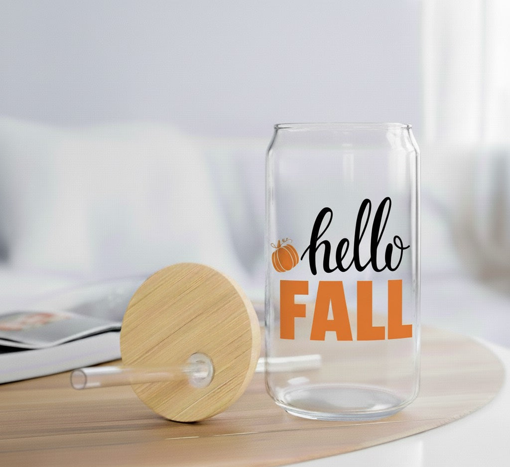 Welcome the change of season with this cozy "Hello FALL" glass can cup! Featuring a playful script for "hello" and bold, orange block letters for "FALL," accented with a cute little pumpkin, this cup is the essential piece of autumn drinkware.