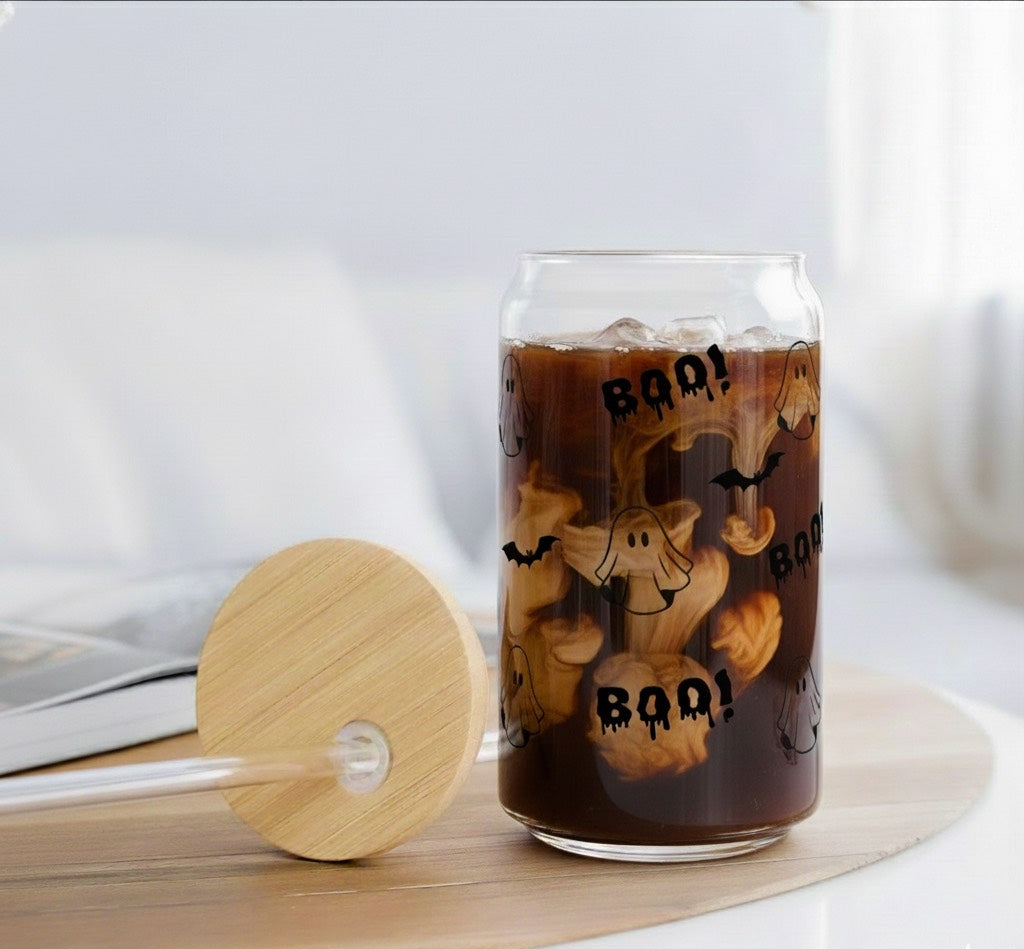 Get into the Halloween spirit with this adorable yet spooky glass can cup! This drinkware features a playful, all-over pattern of floating ghosts, flying bats, and the dripping word "BOO!" in bold black vinyl.